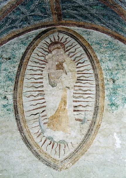 Nur schemenhaft ist die Mondsichelmadonna in der Burgkapelle von Ziesar (Landkreis Potsdam-Mittelmark, Land Brandenburg) zu erkennen. Das Wandbild wurde nach der Reformation (1539) übermalt, im 19. Jahrhundert wiederentdeckt und 2004 restauriert.