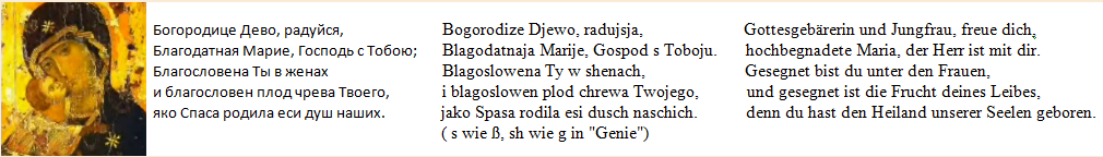 "Bogorodize Djewo" Nach Lukas 1,28ff: "Gottgebärende Jungfrau, freue dich, ..., der Herr ist mit dir." (Text s. u.) |