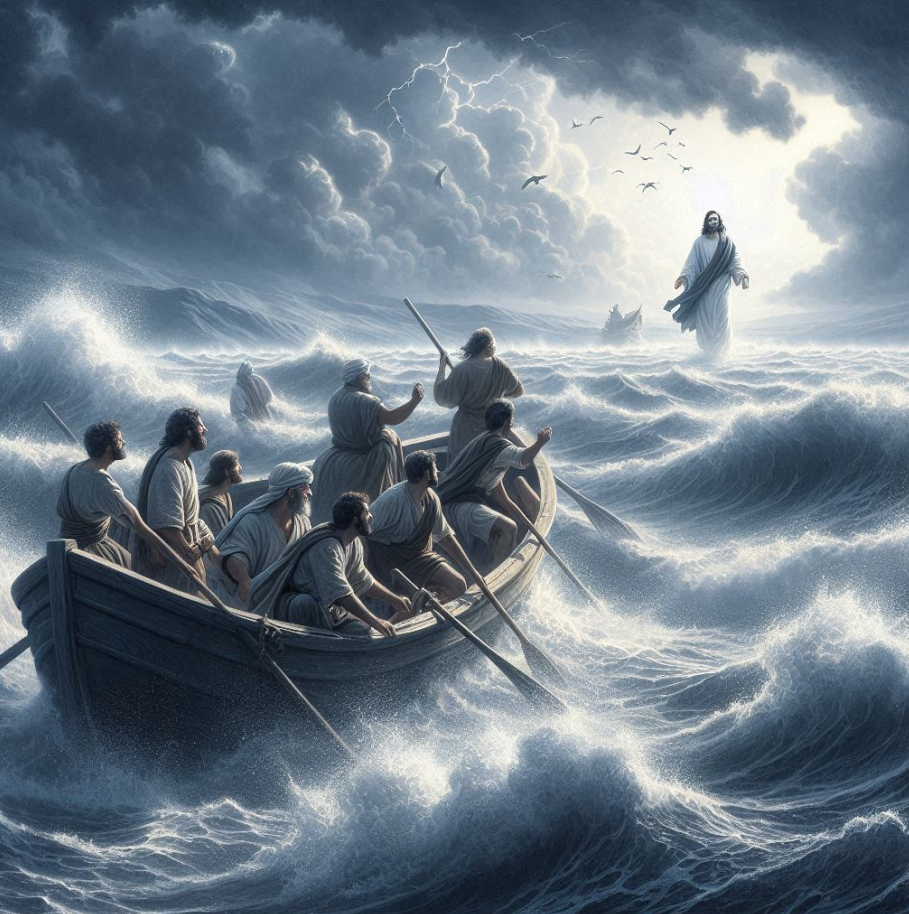 Jesus kommt ihnen auf dem Wasser entgegen. Zuerst erkennen sie ihn nicht und glauben an ein