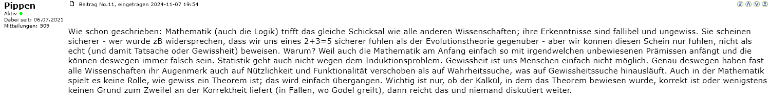 Das Problem der Mathematik/Logik aus erkenntnistheoretischer Sicht liegt dann darin, ob ihre Axiome wahr sind. Sind sie es, dann wären mathematische Sätze wirklich wahr, sind sie es nicht, dann wäre das offen; sie könnten dann auch falsch sein. Die Mathematik kann darüber aber keine Auskunft geben, es geht über ihren Horizont, so dass sich ihre ganze Erkenntnis darin erschöpft, dass „x wahr ist, wenn y wahr ist“ (das gilt auch für die Implikation selbst, die in x einsetzbar wäre); mehr kann sie nicht bieten, aber da ist sie nicht allein. Noch niemand hat Wahrheiten gefunden, die garantiert auch wahr sind. Dafür fehlt uns der Verstand bzw. schlimmer: der Verstand selbst zeigt uns, dass er es nicht kann. Und so bleiben wir blinde Sucher, in der Hoffnung, doch öfter als selten Wahrheit zu finden, aber nie den Moment der Gewissheit genießen zu können; selbst das ist freilich unsicher, was wieder die Hoffnung nährt, eines Tages doch den großen Wurf zu landen. Irgendwann muss man sich dann aus diesem Hamsterrad verabschieden, sonst wird man irre und bringt es zu nichts.