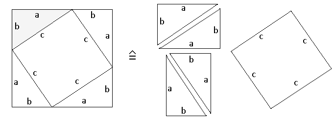 Den Figuren entnimmt man (a+b)2=2ab+c2, woraus a2+b2=c2 folgt. Das ist der Satz von Pythagoras (um 570 bis 510 v. Chr.), der für viele praktische Aufgaben und die Herleitung weiterer Lehrsätze von Nutzen ist. Ausführlich wird über ihn z. B. hier berichtet. Dort werden auch die "Möndchen des Hippokrates" erwähnt, eine Figur mit krummlinig begrenzten Teilen.