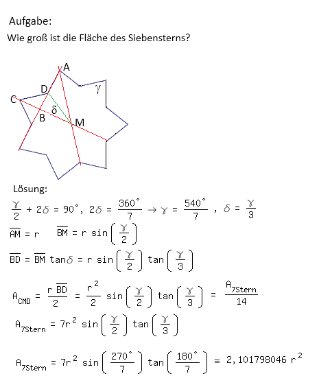 A = 7 r2 cos(360°/7) tan(180°/7), vgl. hier,