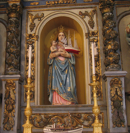In der Pfarrkirche von Alvor, Portugal, findet man eine Marienstatue mit einem Schiff: