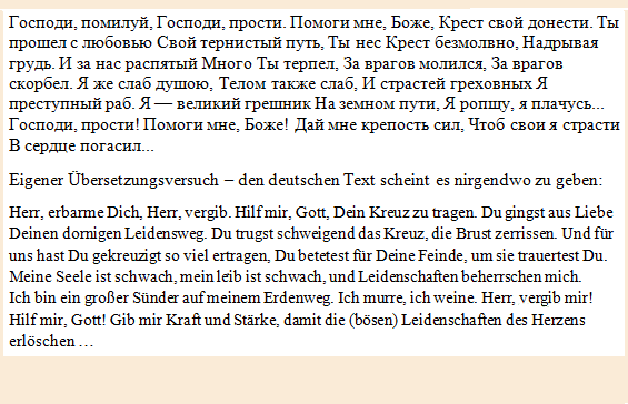 "Gospodi pomiluj" - das "Herr, erbarme dich" in der russisch-orthodoxen Kirche, dort aber viel länger, s. u. |