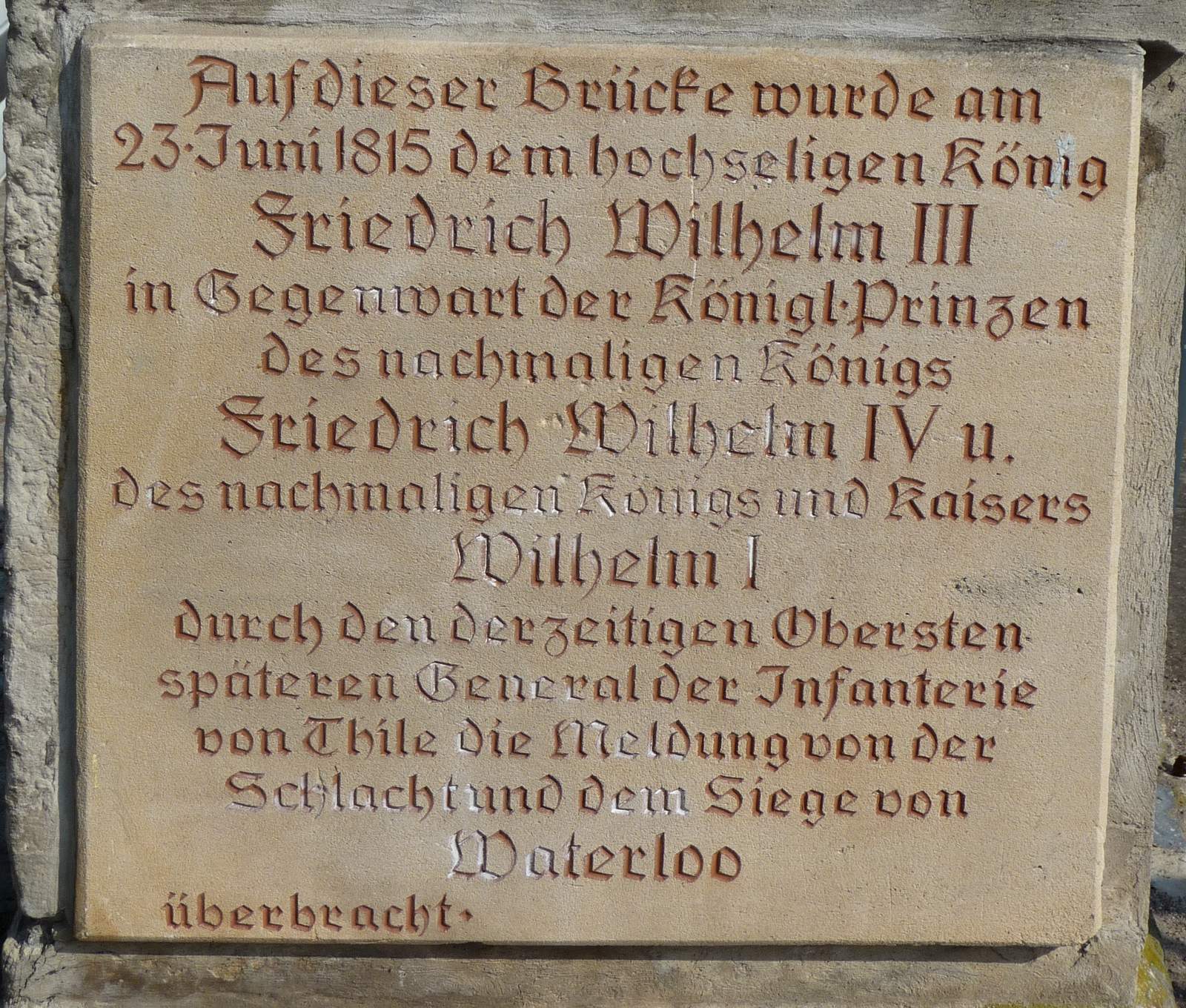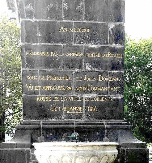 vorhandene Inschrift bestehen und setzte eine eigene darunter: "Vu et approuvé par nous commandant russe de la ville de Coblentz le 1er janvier 1814."