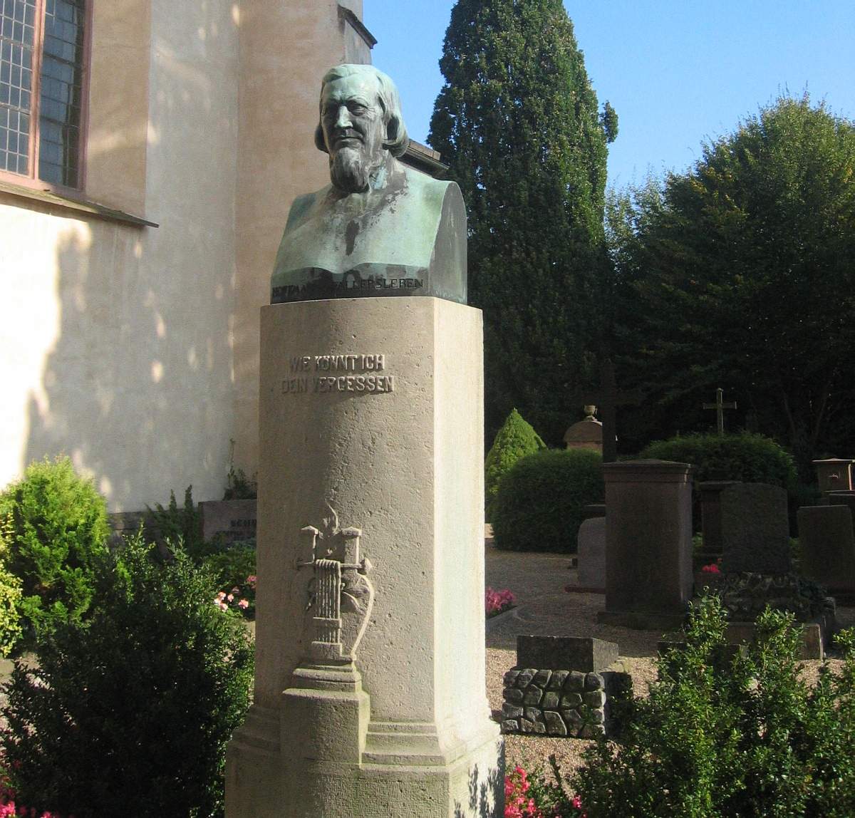 Links: Mainz; rechts: Grabstein für Hoffmann von Fallersleben in Corvey
