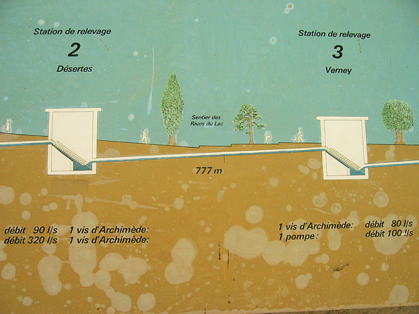 Links: am Genfer See bei Lausanne. Schematische Darstellung von Pumpstationen mit archimedischer Schraube.