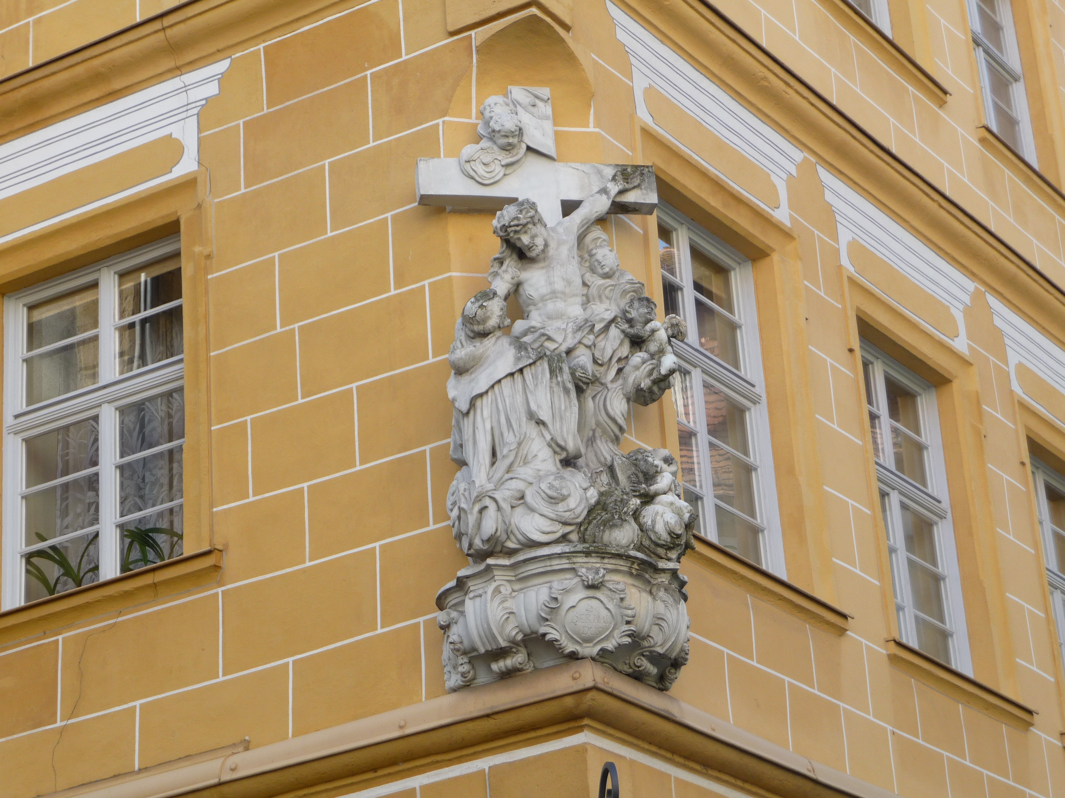 Seltene Figurengruppe: der gekreuzigte Jesus beugt sich zu jemandem herab (Straßenecke in Bamberg), mehr