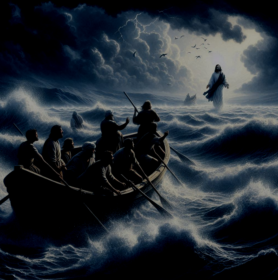 Jesus kommt ihnen auf dem Wasser entgegen. Zuerst erkennen sie ihn nicht und glauben an ein