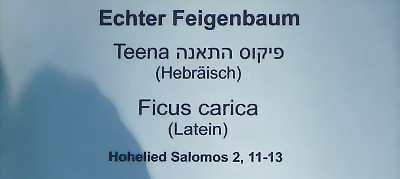 In ihm wachsen mehrfach der Weinstock, der Feigen- und Olivenbaum (in der Bibel meist Ölbaum genannt) sowie verschiedene Kräuter- und Gewürzpflanzen. Am Fuße vieler Pflanzen, Sträucher und Bäume stehen Namensschilder in deutscher, lateinischer und hebräischer Sprache mit zugehörigen Textabschnitten aus der Bibel, wie zum Beispiel hier: