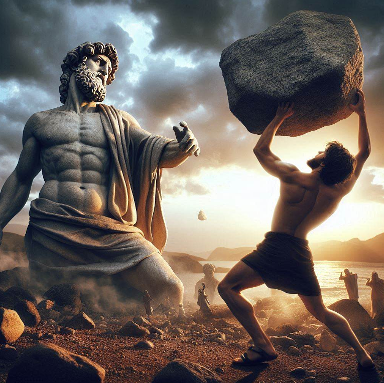 wobei Goliath eher aussieht wie die Statue eines antiken Philosophen.