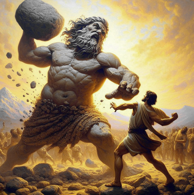 Beim dritten Bild wirft Goliath einen Stein, und David ist unbewaffnet: