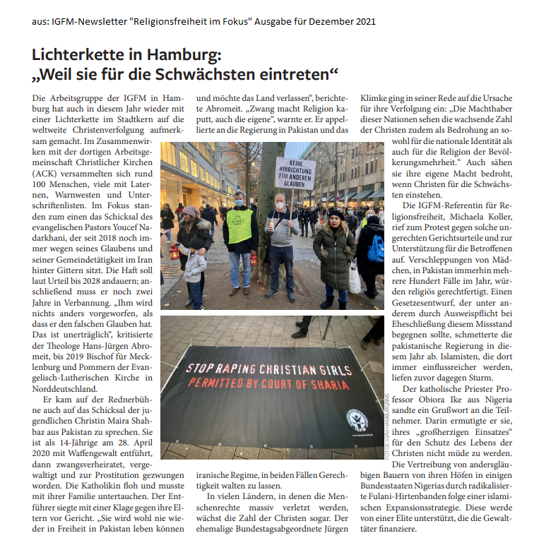https://vimeo.com/893341451/54b9ec1bc Lichterkette am 18.11.2023 - "Freiheit für verfolgte Christen in Pakistan!" Weitere Themen: die Lage der christlichen Armenier, die von der Gewalt durch das muslimisch geprägte Nachbarland Aserbaidschan bedroht sind, und der massenhafte Mord an Christen im Norden Nigerias. - Ein Echo auf die Hamburger Lichterkette