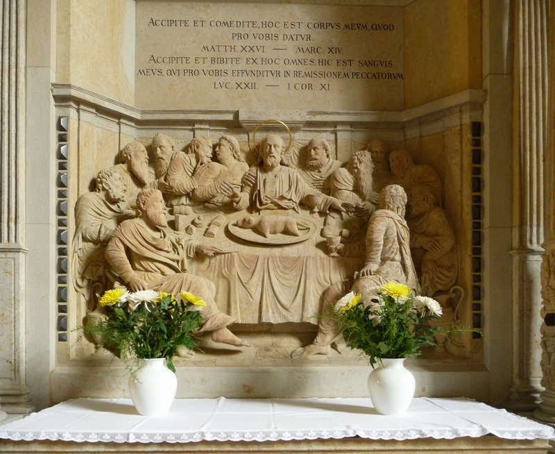 Das nächste Bild zeigt einen Teil des Altars der St.Johanniskirche in Bad Schandau mit schöner Sandsteinskulptur zum letzten Abendmahl Jesu mit seinen Jüngern: