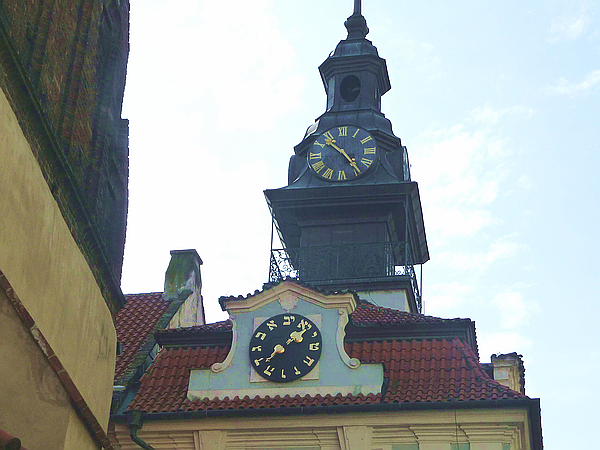 Neben der Altneu-Synagoge steht das jüdische Rathaus mit zwei unterschiedlichen Uhren: