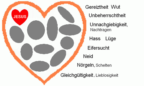 Wenn viele davon zusammenkommen, bleibt in unserem Herzen nur wenig Raum für JESUS. Um von üblen Gewohnheiten und Verhaltensweisen befreit zu werden, benötigen wir Gottes Hilfe und bitten deshalb auch im Vaterunser um Erlösung von dem Bösen.