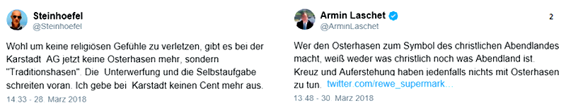 3 In einer Predigt wurde über den Osterhasen und das Eiersuchen gespottet und über diejenigen, die dem "heidnischen" Brauch folgen, gleich mit. Dabei sind das Weihnachtsfest zur Wintersonnenwende und der in vielen Kirchen aufgestellte, große Tannenbaum ebenso heidnischen Ursprungs wie die meisten bzw. alle unsere Wochentags- und Monatsnamen, worüber sich niemand aufregt. – Die Reaktion auf den "Traditionshasen" war unberechtigt und dumm.