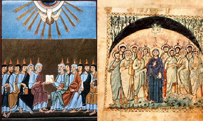 Auf dem Bild oben rechts und einem sehr alten von 586 [3] ist Maria inmitten der Jünger als ein Symbol für die Kirche zu sehen, die nach christlicher Überlieferung zu Pfingsten gegründet wurde. Gefeiert wurde es ab dem Jahr 130. [3] Um die Zeit, lange davor und noch lange danach, fanden im Römischen Reich schwere Christenverfolgungen statt. [4]