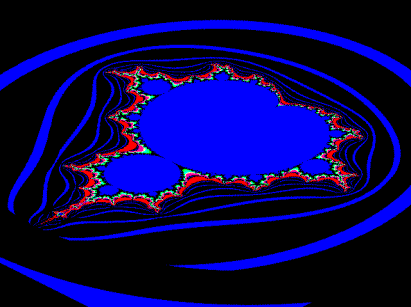Eng mit den komplexen Zahlen hängen auch bestimmte Fraktale zusammen, unter ihnen das berühmte "Apfelmännchen", das hier in perspektivischer Lage und in direkter Aufsicht gezeigt wird: