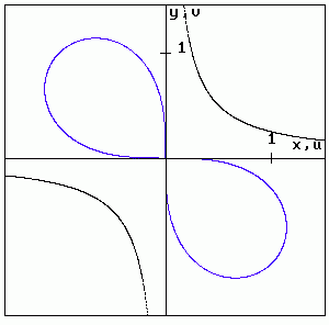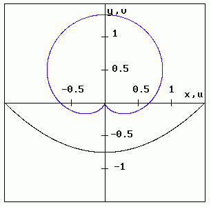 Bei der komplexen Abbildung w=1/z (z=x+iy, w=u+iv) entspricht einem Kreis der z-Ebene, der nicht durch den Ursprung geht, ein Kreis in der w-Ebene, der dort ebenfalls den Ursprung meidet. Man nennt die beiden Kreise miteinander "verwandt" und spricht von Kreisverwandtschaft. Bewegt sich statt dessen der Originalpunkt auf einer Hyperbel mit der Gleichung y=a/x, a>0, dann ist die Bildkurve eine Lemniskate mit a(u2+v2)2=-uv. Beide Kurven sind also über die Abbildung w=1/z ebenso miteinander verwandt wie die genannten Kreise. - Wählt man als Bahnkurve des Originalpunktes die Parabel mit der Gleichung y=x2/3-3/4, erhält man eine Kardiode, deren Gleichung 9(u2+v2)2+(u2+v2)v+4u2=0 lautet. Auch hier besteht durch w=1/z eine Kurvenverwandtschaft. Die beiden folgenden Figuren veranschaulichen dies (Originalkurve schwarz, Bildkurve blau):