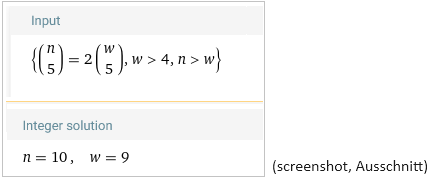 und damit w=9 ergibt. Eine schwarze Kugel, neun weiße, insgesamt zehn Kugeln in des Professors Tasche ist also eine Lösung der Aufgabe. (Sie steht auch auf dem MP.)