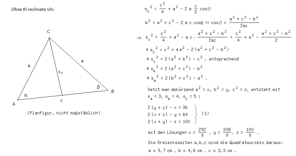 Ein eigener Lösungsversuch mit KI schlug fehl. ChatGPT wählte für die Seitenhalbierenden einen falschen Ansatz und erhielt viel zu kleine Seitenlängen im Millimeterbereich, ohne daran Anstoß zu nehmen. Als ich ihr den richtigen Ansatz mitteilte, meinte die KI, sie könne das quadratische Gleichungssystem mit 4sc²=2(a²+b²)-c² usw. nicht lösen und empfahl die Verwendung eines "mathematischen Softwarepakets". Auf die naheliegende Substitution a²=x, b²=y, c²=z kam sie nicht. Beim Lösen des daraus folgenden linearen Gleichungssystems (1) (das ich ebenfalls mitteilte) verrechnete sich ChatGPT, stieß auf einen Widerspruch und behauptete, ein solches Dreieck gäbe es nicht. (April 2024)
