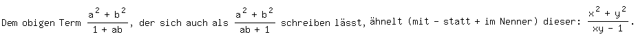 Zu zeigen ist: Wenn zwei natürliche Zahlen a unb b so gewählt werden, dass der Nenner des Bruches (a²+b²)/(1+ab) ein Teiler des Zählers ist, d. h., wenn der Bruch eine ganze Zahl ist, dann ist diese eine Quadratzahl.