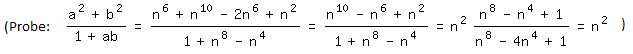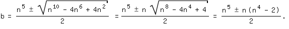 Um darauf zu antworten, wird a=n³ in (1) eingesetzt und b neu berechnet. Die sich dabei ergebende quadratische Gleichung b2-n5b+n6-n2=0 hat die Lösung
