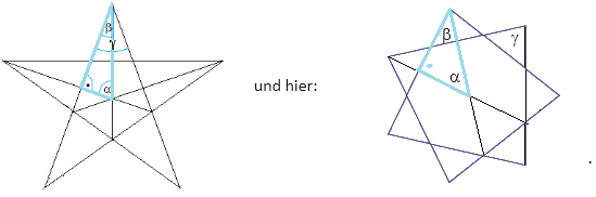 Dabei ist α = 360°/n, n=Anzahl der Sternzacken. Daraus folgt γ = 180°(1 - 4/n), und mit dieser einfachen Formel gelangt man schnell zu weiteren Ergebnissen: