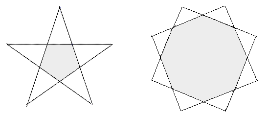 Sie entstehen dadurch, dass einander nicht berührende Seiten eines regelmäßigen Vielecks verlängert und zum Schnitt gebracht werden. Bei ihnen wollte ich wissen, wie die Größe ihrer Innenwinkel von der Anzahl der Zacken abhängt.