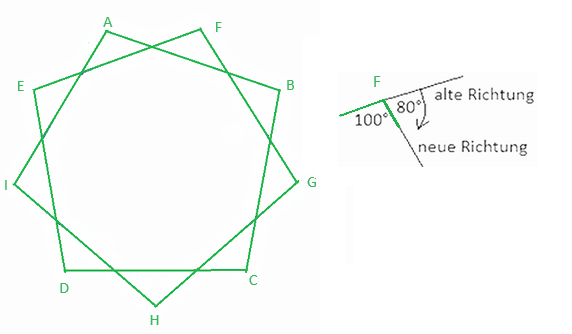Der Neunstern lässt sich auch auf andere Weise zeichnen. Sie besteht darin, dass man auf einer Strecke mit beliebig gewählter, konstanter Länge entlang geht und an ihrem Ende um 80°(=180°-100°) abbiegt. Dies wird achtmal wiederholt, bis man wieder am Ausgangspunkt ankommt:
