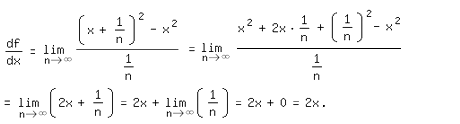 Wie Dx "immer kleiner und kleiner wird" (was auch gesagt wird), bleibt offen. Eine Möglichkeit ist die fortlaufende Halbierung von Dx, eine andere, dass man Dx=1/n setzt, wobei n eine natürliche Zahl ist, die immer größer und größer wird. Dies kann dadurch geschehen, dass n ständig verdoppelt oder im Sinne der Peano-Axiome durch seinen Nachfolger n+1 ersetzt wird, und somit "gegen Unendlich" geht.
