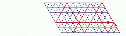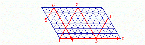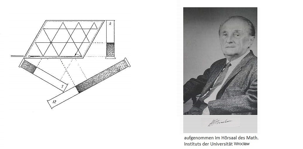 Anmerkung: Dass sich die Billardkugel nach der Ankunft beim 120°-Winkel so bewegt, wie es die Strecke von (1) nach (2) anzeigt und von Steinhaus behauptet wird, kann ich mir nicht recht vorstellen. Ich habe eher das Gefühl, dass sie in diesem Fall am Rand des Billardtisches weiterrollt, anstatt scharf abzubiegen. (Ansonsten, d. h. wenn sie die Bande mittendrin an anderen Stellen trifft, folgt die Kugel, wie vorausgesetzt, dem Reflexionsgesetz "Einfallswinkel=Ausfallswinkel".) Selbst wenn der Steinhaussche "Analogrechner", wie man ihn nennen könnte, in der Praxis funktioniert, ist das graphische Verfahren durchaus von Nutzen. Niemand wird sich zur Lösung von Umfüllaufgaben extra einen Billardtisch mit 60- und 120-Grad-Winkeln bauen; ein gleichseitiges Dreieck mit Gitternetzlinien ist dagegen schnell gezeichnet, wenn man durch Nachdenken und Probieren nicht weiterkommt.