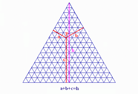 Fällt man von einem Punkt P im Innern oder auf dem Rand eines gleichseitigen Dreiecks das Lot auf die Seiten, so ergeben die Längen aller drei Lote zusammen die Länge der Dreieckshöhe: a+b+c=h.