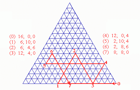 Von hier aus gehen wir zum Punkt 1 mit a=6, b=10 und c=0, dann nach Punkt 2 mit a=6, b=4, c=6 und so weiter bis Punkt 7, der die letzte Zeile der Tabelle wiedergibt.