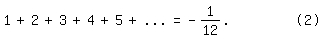 Die Zeile (2) stiftet unter Schülern und mathematisch interessierten Laien Verwirrung und wabert durch das Internet. Widersprochen wird ihr in dem englisch geschriebenen Blog "No, the sum of all the positive integers is not -1/12". Am Ende des Blogs (vor den sich anschließenden Kommentaren) wird auf die so genannte "Ramanujan-Summation" verlinkt. Ihren Namen hat sie nach dem vielfach als genial bezeichneten, früh verstorbenen indischen Mathematiker Srinivasa Ramanujan. Von ihm stammt (2), ursprünglich ohne besonderen Hinweis auf etwas Neues, Ungewohntes, vgl. hier, Abschnitt "Sum of divergent series".