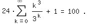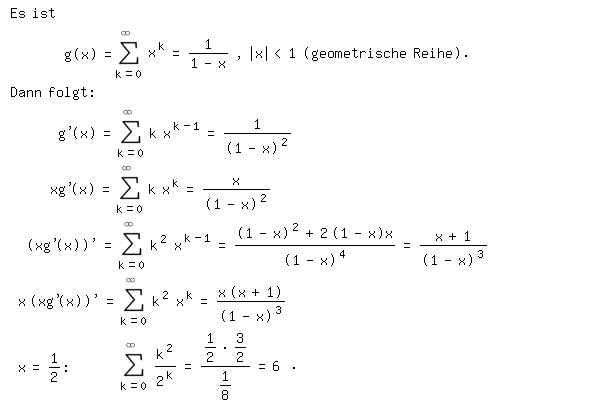 Ergänzung: Durch nochmaliges Ableiten und Multiplizieren mit x erhält man für x=⅓ den Wert der Reihe ∑k³/3k (Details oben mit •),