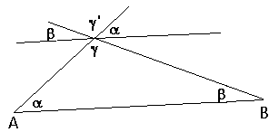 dann liegt zwischen den Winkeln β und α der Winkel γ'. An ihm ist zu sehen, daß er ebenso groß ist wie der Winkel γ; einen Grund dafür, daß er größer oder kleiner sein könnte, gibt es nicht. Dazu bedarf es keines besonderen Beweises, und so legen wir die Gleichheit von γ' und γ axiomatisch fest.1 Dann folgt aus β+γ'+α=180°: α+β+γ=180°, was zu zeigen war.