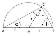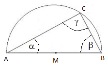 Da die Dreiecke AMC und MBC gleichschenklig sind, ist der linke Teilwinkel von γ gleich α und der rechte gleich β, d. h. es ist γ=α+β. Wegen α+β+γ=180° ⇔ γ=180°-(α+β) folgt 2γ=180°, γ=90°, wie vermutet.