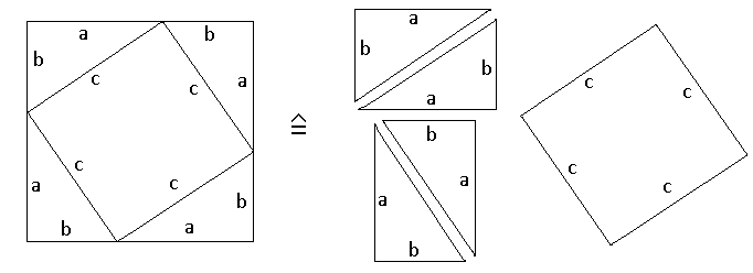 Den Figuren entnimmt man (a+b)2=2ab+c2, woraus a2+b2=c2 folgt. Das ist der Satz von Pythagoras (um 570 bis 510 v. Chr.), der für viele praktische Aufgaben und die Herleitung weiterer Lehrsätze von Nutzen ist. Bekannt war er bereits den Babyloniern und auch im fernen China. Obwohl für die Richtigkeit einer Behauptung ein Beweis genügt, soll es für den Satz von Pythagoras, dessen Bezeichnung mit dem Namen des griechischen Weisen von Euklid (ca.360 bis ca.280 v. Chr.) stammt, inzwischen über hundert Beweise von Matheprofis und -amateuren geben.