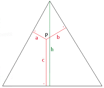 Bei ihm zeigt die Anschauung (durch Nachmessen), daß die vom beliebigen Punkt P ausgehenden Lotstrecken a,b,c zusammen so lang wie die Höhe h sind.