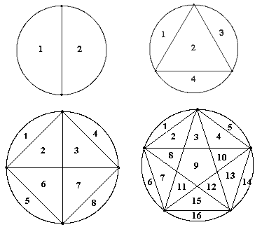 Nicht immer führt Anschaulichkeit zum richtigen Ergebnis, sondern bisweilen auch in die Irre. Dies zeigt sich bei der folgenden Frage: in wieviele Teile wird die Fläche eines Kreises durch die Diagonalen und Seiten eines auf dem Kreisumfang liegenden, regelmäßigen n-Ecks zerlegt?