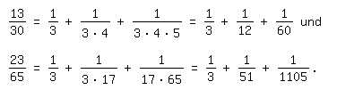 Interessant ist nun, daß sich das Beispiel von [1], wie bereits dort erwähnt, und auch unser zweites Beispiel als Summe von Stammbrüchen schreiben lassen, d. h. Brüchen mit dem Zähler 1 und natürlichem Nenner. Mit ihnen rechneten gern die alten Ägypter. Es gilt