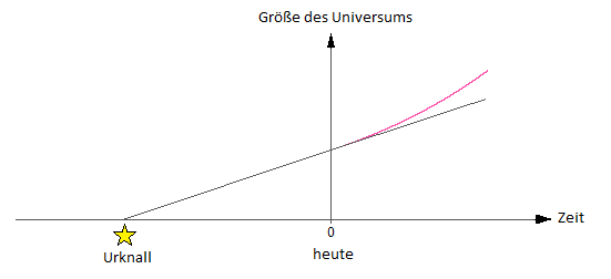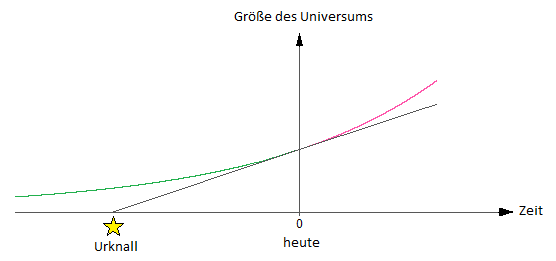 Nach neueren Messungen dehnt es sich dagegen beschleunigt aus. [3] Dies deutet die rote Linie an, die, schlecht zu erkennen, bis zur Ordinatenachse geht.