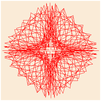 Was kann noch verändert werden? Eine Möglichkeit besteht darin, daß wir anstelle eines Wertes für n zwei verschiedene verwenden: n1 und n2, das eine bei x, das andere für y. So entsteht etwa mit n1=3 und n2=5 folgendes Gebilde, das nicht das Geringste mehr mit Zahnrädern und Flügelfiguren zu tun hat: